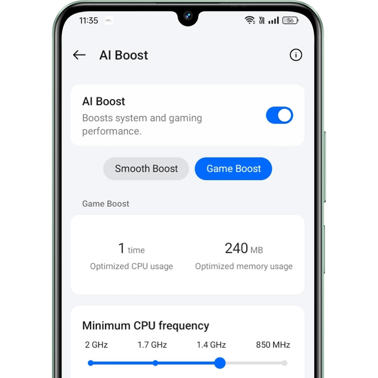 Βίωσε το επόμενο επίπεδο ομαλής χρήσης. Το realme C61 είναι εξοπλισμένο με AI Boost, μια προηγμένη λειτουργία αφιερωμένη στην επίτευξη απόλυτης σταθερότητας κατά τη διάρκεια εντατικού παιχνιδιού και πολλαπλών εργασιών.