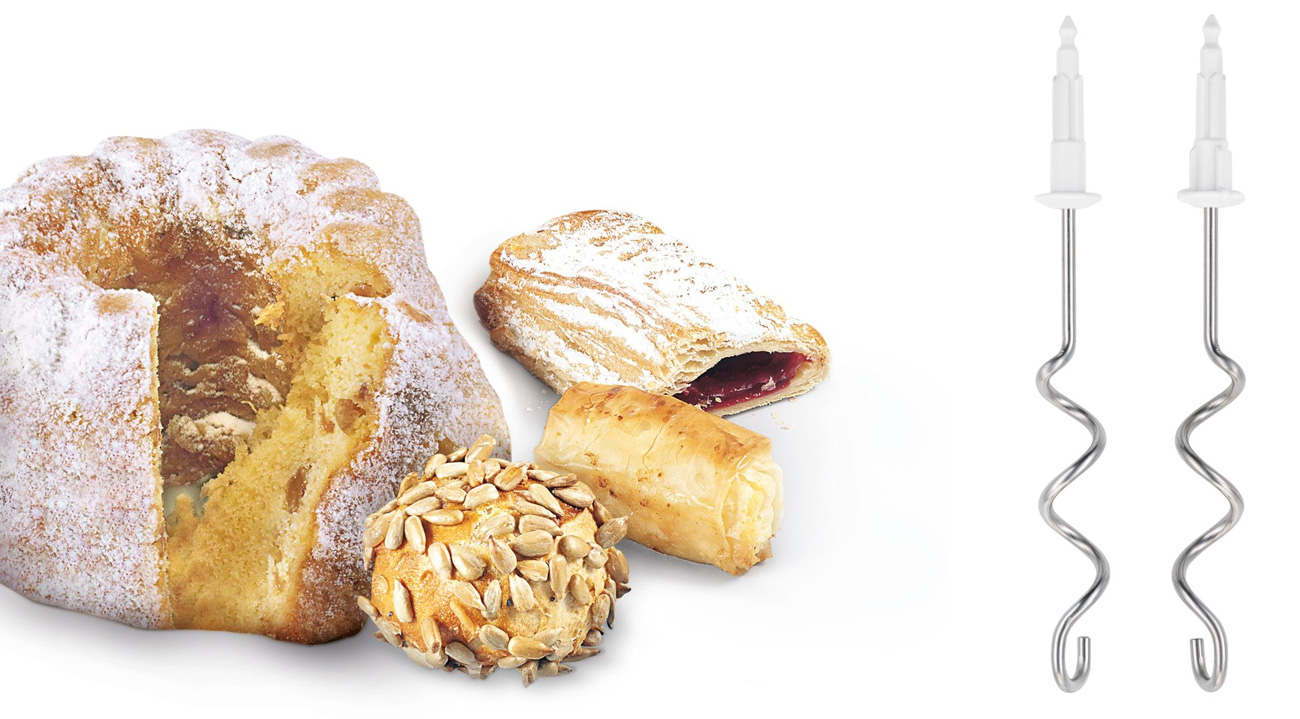Διαθέτει 2 ανοξείδωτα άγκιστρα ζυμώματος για σκληρή ζύμη, όπως ψωμί, κέικ, σφολιάτα, φύλλο πίτας και πολλά άλλα αρτοπαρασκευάσματα.