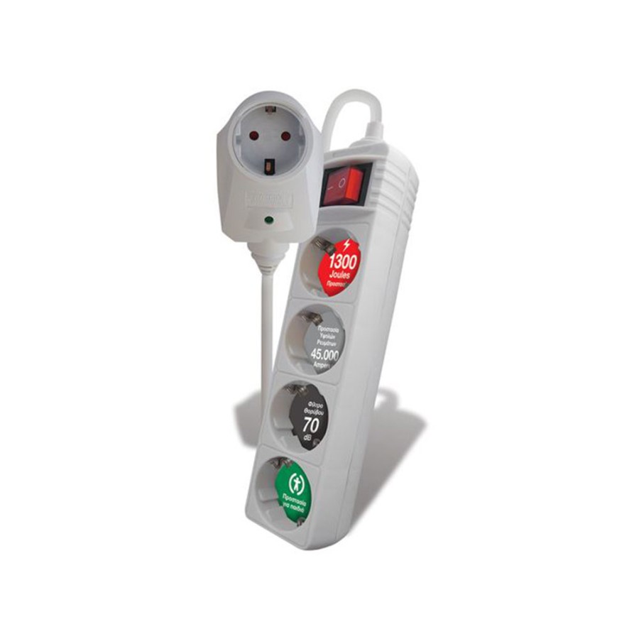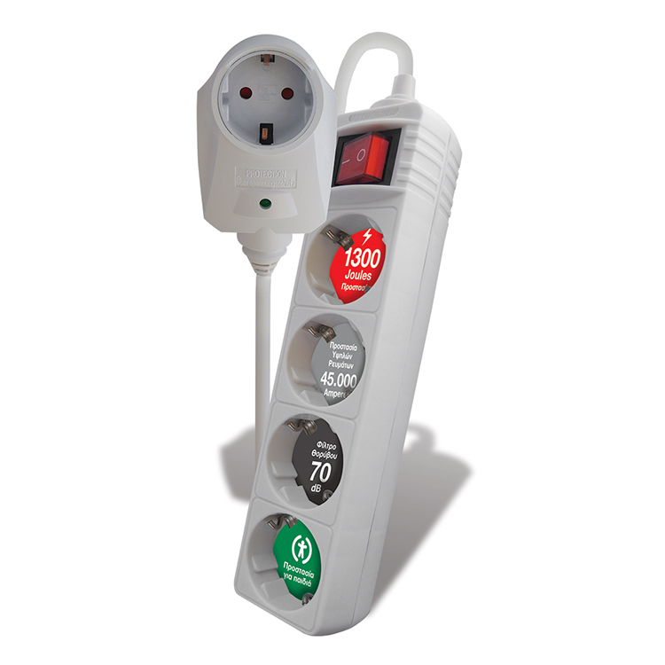Crystal Audio CP-4+1 Θέσεων Πολύπριζο Ασφαλείας White διαθέτει, προστασία υπέρτασης 1.300Joules, προστασία υψηλών ρευμάτων 45.000Amperes, φίλτρο θορύβου 70dB και προστασία για παιδιά.Χαρακτηριστικά