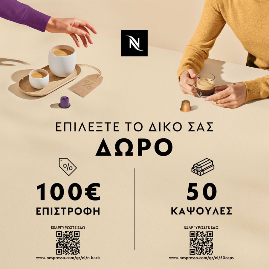 Με την αγορά μηχανής καφέ Original διαλέγεις εσύ την προσφορά που χρειάζεσαι. Επίλεξε ανάμεσα σε 100€ επιστροφή (μέσω των επόμενων 10 παραγγελιών σε original capsules ) ή σε 50 προεπιλεγμένες κάψουλες Nespresso δώρο (στην πρώτη σου αγορά καφέ με ελάχιστη παραγγελία 5 συσκευασίες καφέ nespresso original).