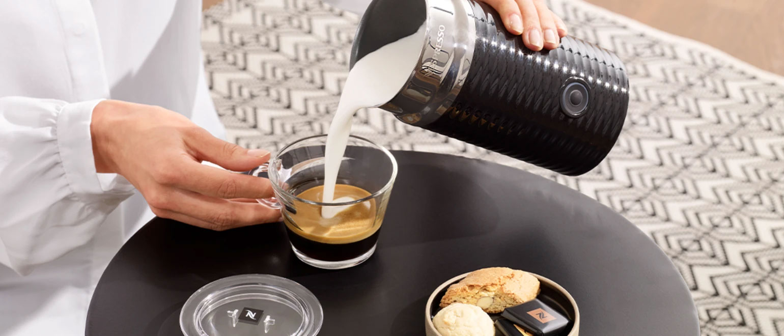 Με την Essenza Mini μπορείς να φτιάξεις τον τέλειο freddo κάθε φορά, χρησιμοποιώντας δύο κάψουλες Nespresso Freddo Delicato ή έναν απολαυστικό cappuccino με μία κάψουλα Nespresso Chiaro, προσθέτοντας αφρό γάλακτος.