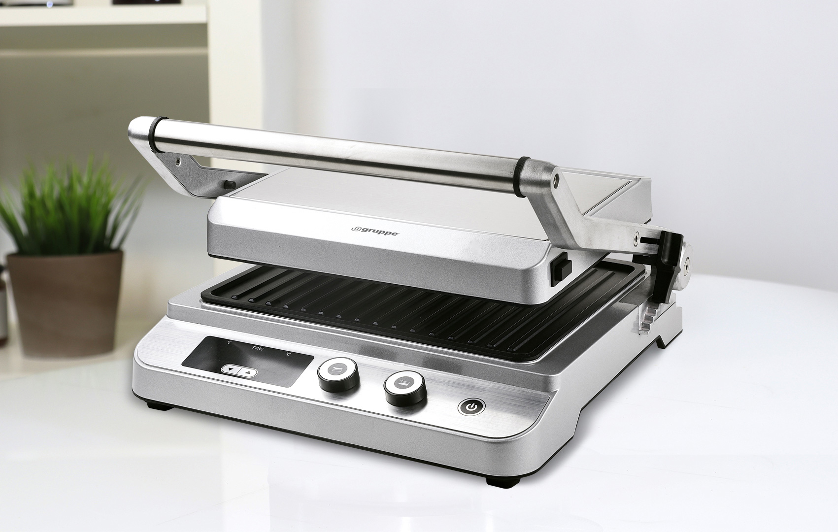Gruppe AJ5015A1 Τοστιέρα Γκριλιέρα Inox με μέγιστη ισχύ 2.000 Watt, αποσπώμενες πλάκες και ψηφιακή ρύθμιση του χρόνου ψησίματος και της θερμοκρασίας.