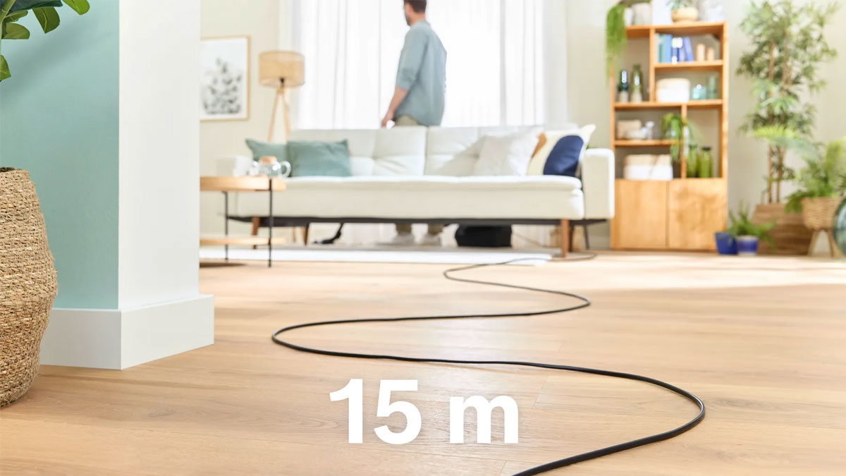 Σκουπίστε χωρίς συχνές αλλαγές πρίζας, με την πολύ μεγάλη ακτίνα δράσης εμβέλειας 15 μέτρων. Με το μακρύ καλώδιο μπορείτε να φτάσετε εύκολα σε μεγάλη απόσταση και να καθαρίσετε γωνίες και άλλη σημεία. Αναβαθμίστε τον τρόπο καθαριότητας στο σπίτι, φτάνοντας σε κάθε σημείο χωρίς κόπο, εύκολα.
