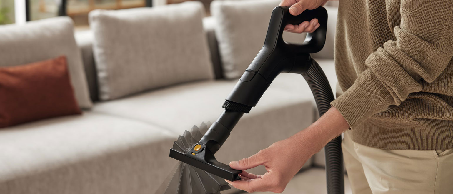 Η Miele Guard L1 είναι εξοπλισμένη με ένα καινοτόμο ακροφύσιο 2 σε 1 – έτσι ώστε να μπορείτε να κάνετε εναλλαγή μεταξύ των εργασιών καθαρισμού γρήγορα και εύκολα. Συνδυάζει ένα πολύ φαρδύ ακροφύσιο ταπετσαρίας και ένα ρύγχος εσοχών σε ένα σχεδιασμό εξοικονόμησης χώρου – για εύκολο καθαρισμό ταπετσαριών και δυσπρόσιτων περιοχών. Χάρη στην βολική θέση αποθήκευσης στο πίσω μέρος της ηλεκτρικής σκούπας, είναι έτοιμο ανά πάσα στιγμή.