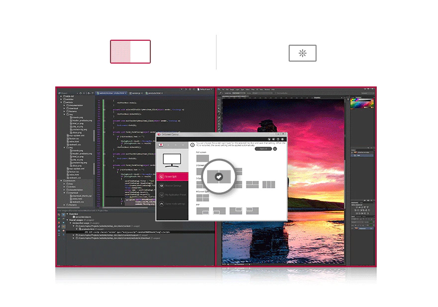 Προσαρμόστε την επιφάνεια εργασίας διαιρώντας την οθόνη ή ρυθμίζοντας τις βασικές επιλογές της οθόνης με μερικά κλικ του ποντικιού. *Για τη λήψη της πιο πρόσφατης έκδοσης του OnScreen Control, επισκεφθείτε την LG.COM. *Οι εικόνες προϊόντος και το OnScreen Control στο βίντεο είναι αποκλειστικά για λόγους απεικόνισης και ενδέχεται να διαφέρουν από το πραγματικό προϊόν και το πραγματικό OnScreen Control.