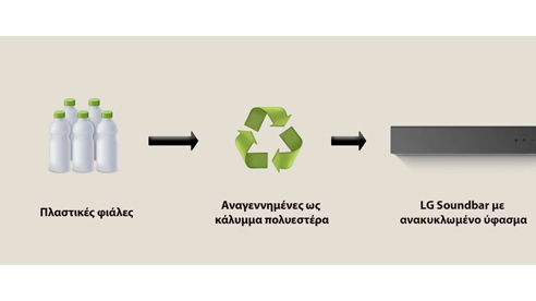 ΟΛΑ τα LG Soundbar σχεδιάζονται προσεκτικά ώστε να εξασφαλίζεται ένα υψηλό ποσοστό ανακυκλωμένων υλικών. Το Παγκόσμιο Πρότυπο Ανακύκλωσης πιστοποιεί ότι το ύφασμα καλυμμάτων πολυεστέρα κατασκευάζεται από πλαστικές φιάλες.