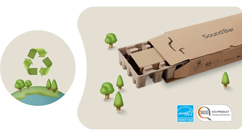 Το LG Soundbar φέρει πιστοποίηση SGS ως οικολογικό προϊόν, λόγω της εσωτερικής συσκευασίας από αφρώδες υλικό EPS (φελιζόλ) και των πλαστικών σακουλών ανακυκλωμένου χαρτοπολτού. Μια φιλική προς το περιβάλλον λύση προστασίας του προϊόντος.