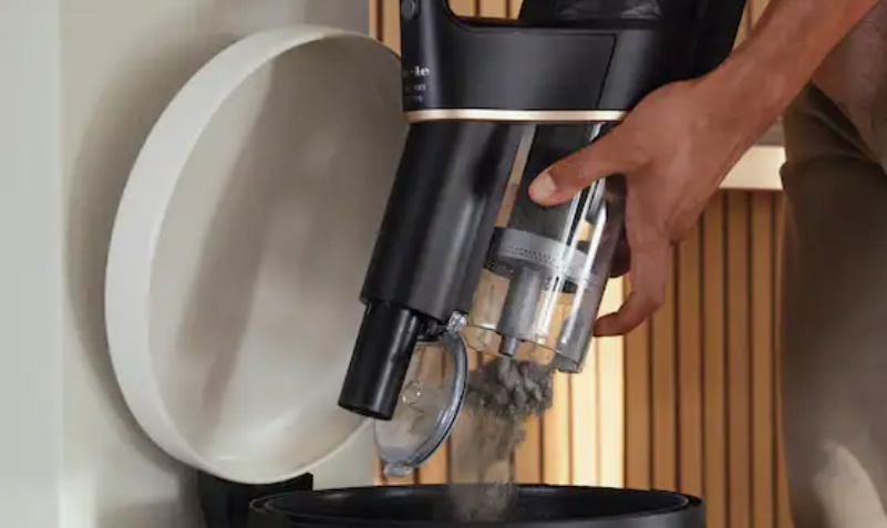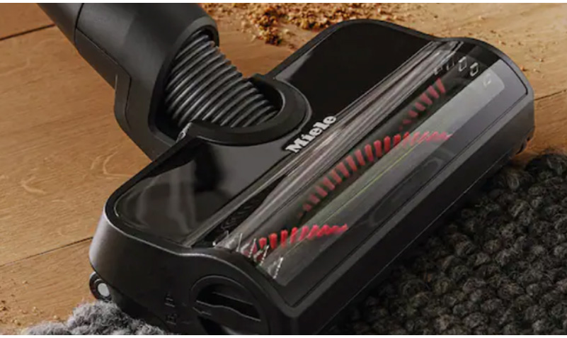 Επαναφορτιζόμενη σκούπα stick Miele, με τεχνολογία Vortex που συγκρατεί αποτελεσματικά τη σκόνη και 2 βαθμίδες, για να προσαρμόζεις την ένταση ανάλογα.
