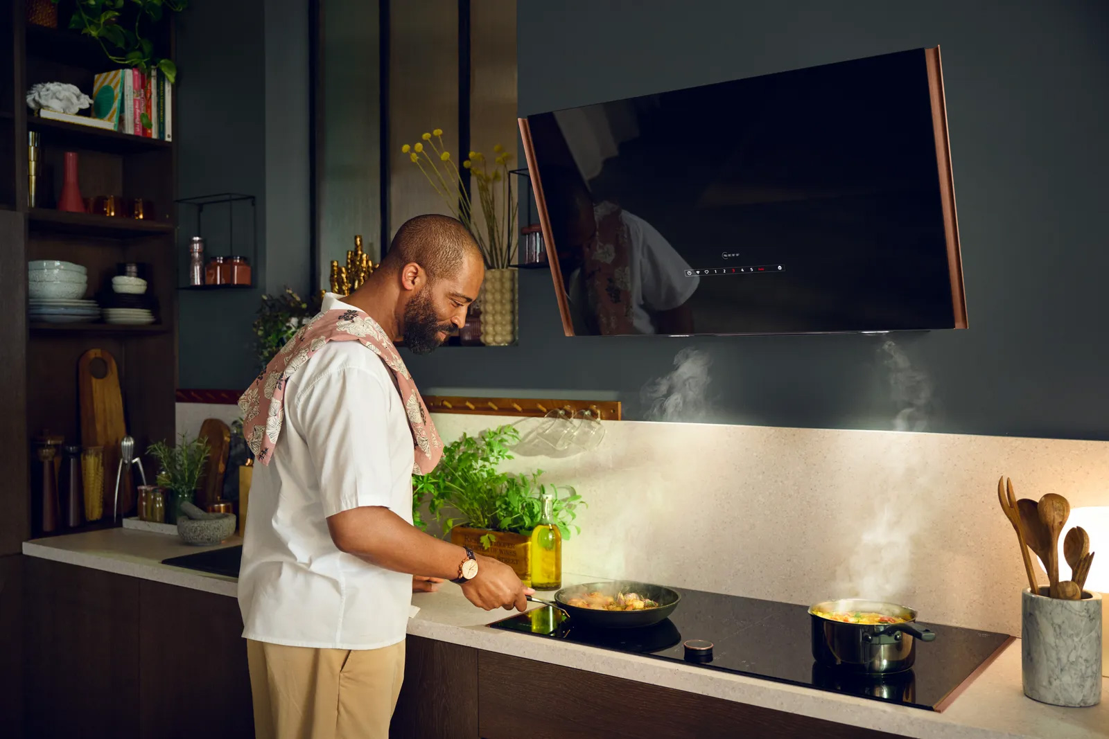Τώρα μπορείτε απλά να επικεντρωθείτε στο μαγείρεμα. Ο απορροφητήρας NEFF είναι συμβατός με την εστία σας και ελέγχεται αυτόματα από αυτή μέσω της εφαρμογής Home Connect. Πιο συγκεκριμένα, ένας αλγόριθμος παρακολουθεί τις ρυθμίσεις που κάνετε στην εστία σας κατά το μαγείρεμα. Έτσι, μόλις ξεκινήσετε να μαγειρεύετε, ο απορροφητήρας ενεργοποιείται αυτόματα και ρυθμίζει την ισχύ του αναλόγως. Με αυτό τον τρόπο, η κουζίνα είναι πάντα απαλλαγμένη από οσμές και υδρατμούς και δεν χρειάζεται ποτέ ξανά να καθαρίσετε τα αποτυπώματα στον απορροφητήρα. Αυτός είναι ο νέος και εύκολος τρόπος να μαγειρεύετε.