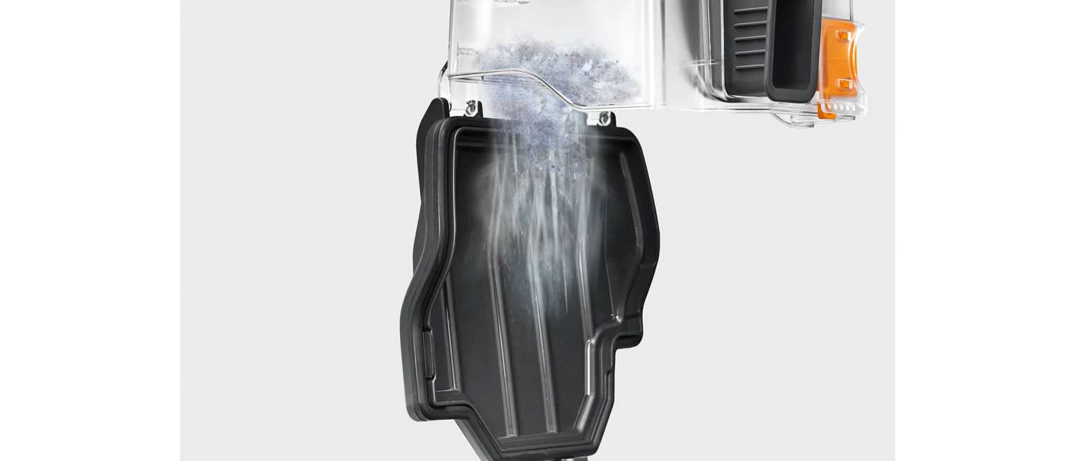 Το πέλμα απλά κουμπώνει στο πλάι της σκούπας, αφήνοντας τον σωλήνα αναρρόφησης σε σταθερή και εύχρηστη θέση εργασίας. Ιδιαίτερη ευφυΐα: Σε επιλεγμένα μοντέλα Complete C3, η λειτουργία του κινητήρα διακόπτεται αυτόματα και δεν χρειάζεται να σκύβετε.