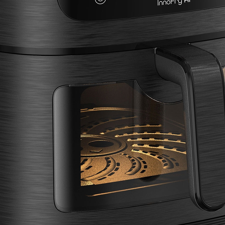 Η συσκευή διαθέτει μεγάλο διπλό τζάμι, αλλά και έντονο φωτισμό στο εσωτερικό του κάδου 8L, για να μπορείς να παρακολουθείς την πρόοδο της προετοιμασίας του φαγητού ανά πάσα στιγμή, χωρίς να χρειάζεται να ανοίγεις τον κάδο και να καθυστερείς την παρασκευή των γευμάτων σου.