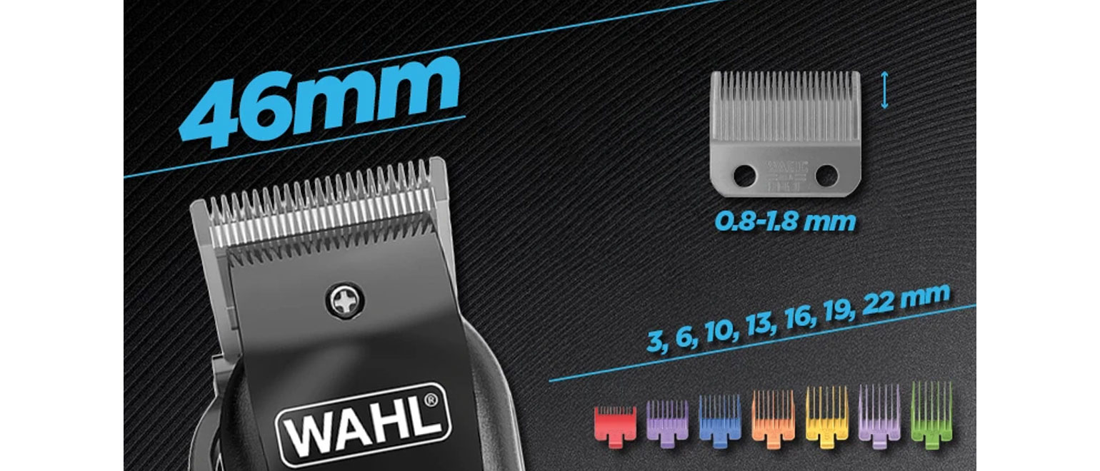 Με πλάτος κοπής 46 mm, η Wahl Multi-Cut κάνει το grooming πιο γρήγορο και ξεκούραστο, καλύπτοντας μεγαλύτερη επιφάνεια με κάθε πέρασμα. Το taper control (0.8-1.8 mm) σου επιτρέπει να ρυθμίζεις εύκολα το μήκος κοπής, ενώ τα 7 χτενάκια-οδηγοί με χρωματική ένδειξη (3-22 mm) κάνουν την επιλογή παιχνιδάκι, απλά διάλεξε το σωστό χρώμα και ξεκίνα!
