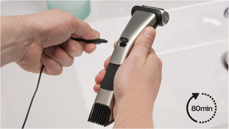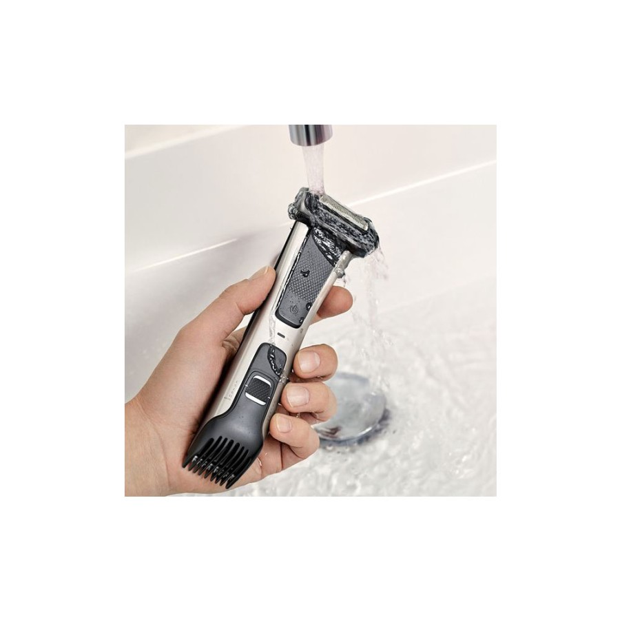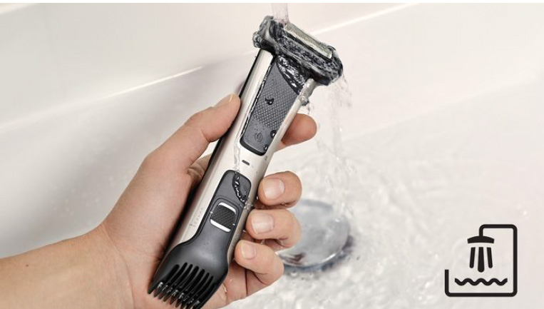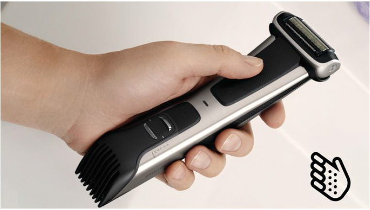 Προσφέρει άνετο και βαθύ αποτέλεσμα μέσα ή έξω από το ντους. Το σύστημα περιποίησης σώματος είναι πλήρως αδιάβροχο. Έτσι, μπορείτε να καθαρίσεις τη συσκευή απλώς ξεπλένοντάς την, μόλις τελειώσεις. Για πιο μακριές τρίχες, η απόδοση τριμαρίσματος μπορεί να είναι καλύτερη σε στεγνή επιδερμίδα.Εργονομική λαβή