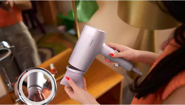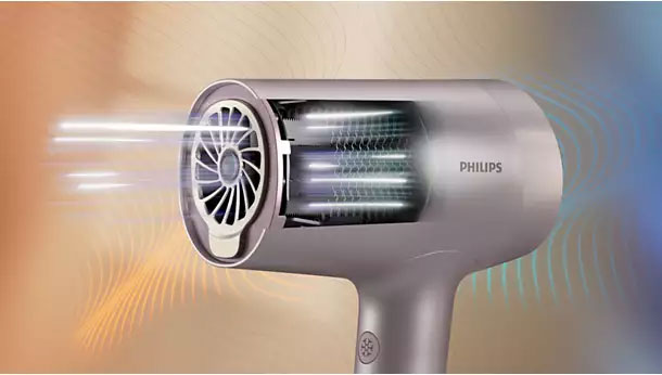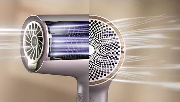 Το πιο αποτελεσματικό σύστημα στεγνώματος βελτιώνει τη ροή του αέρα, την πίεση του αέρα και τη μεταφορά θερμότητας, μειώνοντας το μέγεθος και το βάρος του σεσουάρ*. Αυτό το σεσουάρ 1800W έχει καλύτερες επιδόσεις από το σεσουάρ 2300W της Philips.