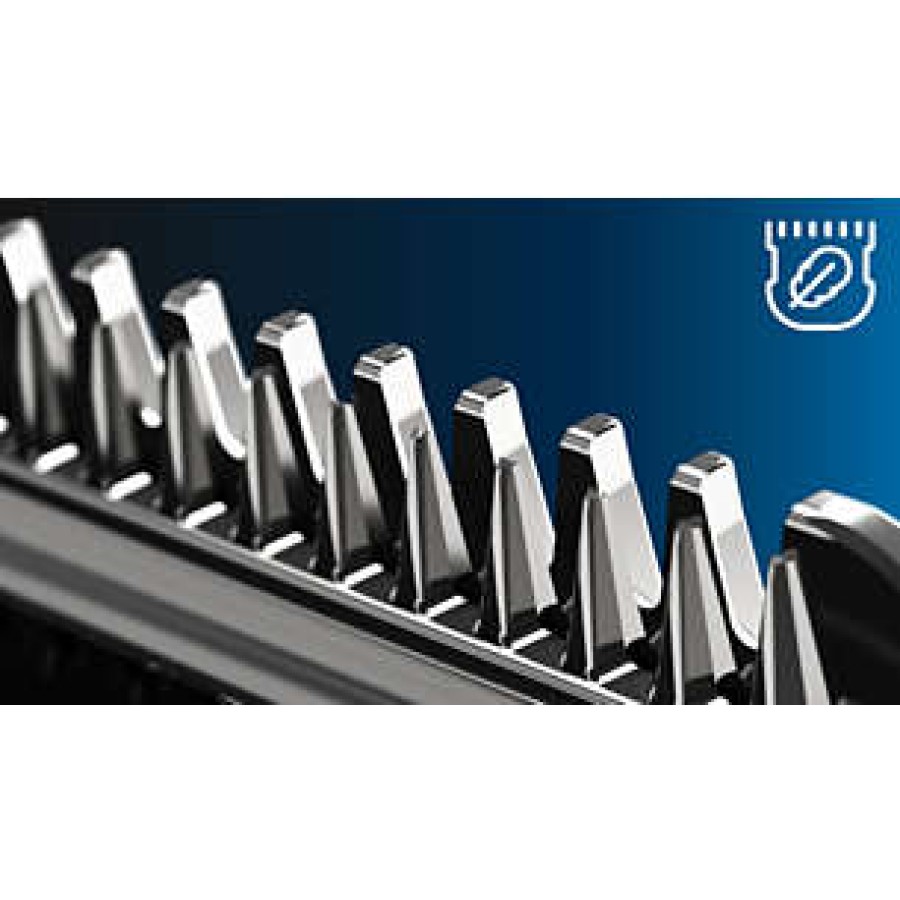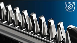 Άψογο και προστατευτικό για το δέρμα σας τριμάρισμα, κάθε φορά. Οι ατσάλινες λεπίδες του τρίμερ τρίβονται ελαφρά η μία πάνω στην άλλη και έτσι ακονίζονται καθώς εσείς τριμάρετε, για να είναι πάντα εξαιρετικά κοφτερές και αποτελεσματικές, όπως την πρώτη μέρα.