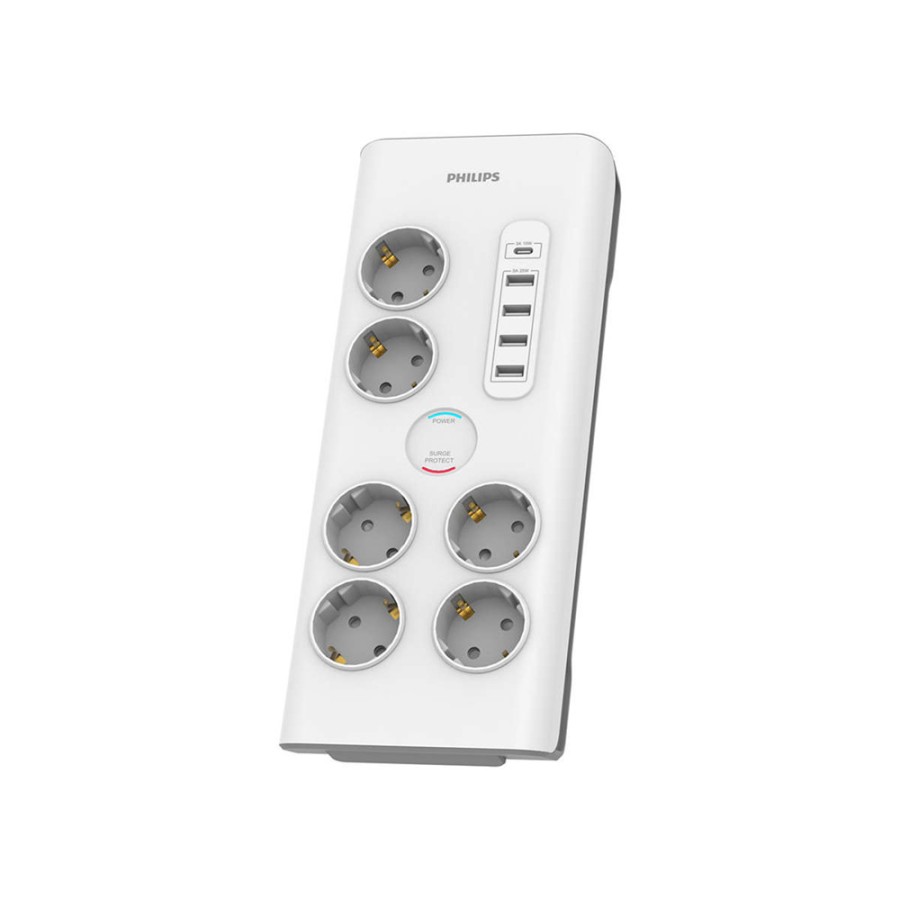 Πολύπριζο ασφαλείας PHILIPS SPN7060WA/GRS με 6 θέσεις, 5 θύρες φόρτισης μέσω USB, προστασία από υπέρταση 900J και διπολικό διακόπτη.