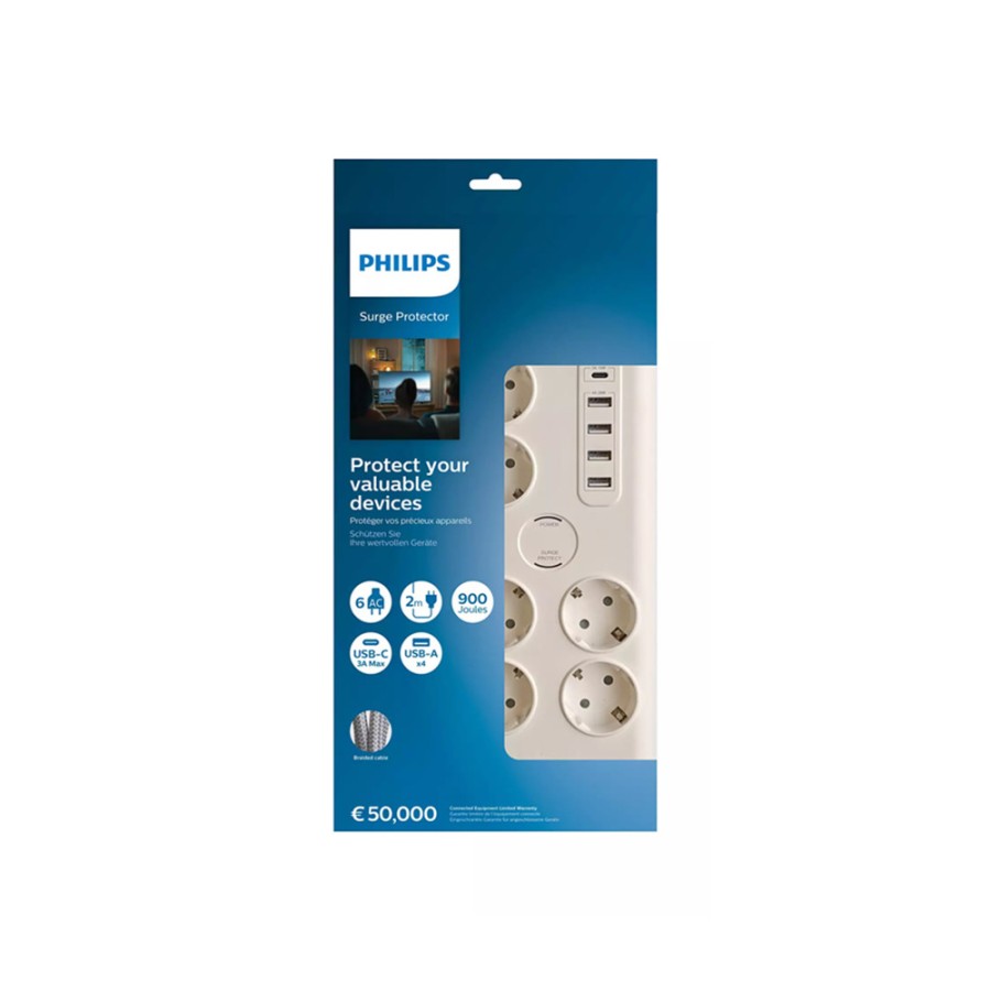 Το πολύπριζο ασφαλείας PHILIPS SPN7060WA/GRS διαθέτει 6 γειωμένες πρίζες σούκο και ενσωματωμένη φόρτιση USB 35W για φορητές συσκευές. Είναι σχεδιασμένο για να προστατεύει τον εξοπλισμό σας από ηλεκτρικές υπερτάσεις, διακόπτοντας αυτόματα τη λειτουργία του συστήματος κατά τις διαδοχικές υψηλές διακυμάνσεις ρεύματος.