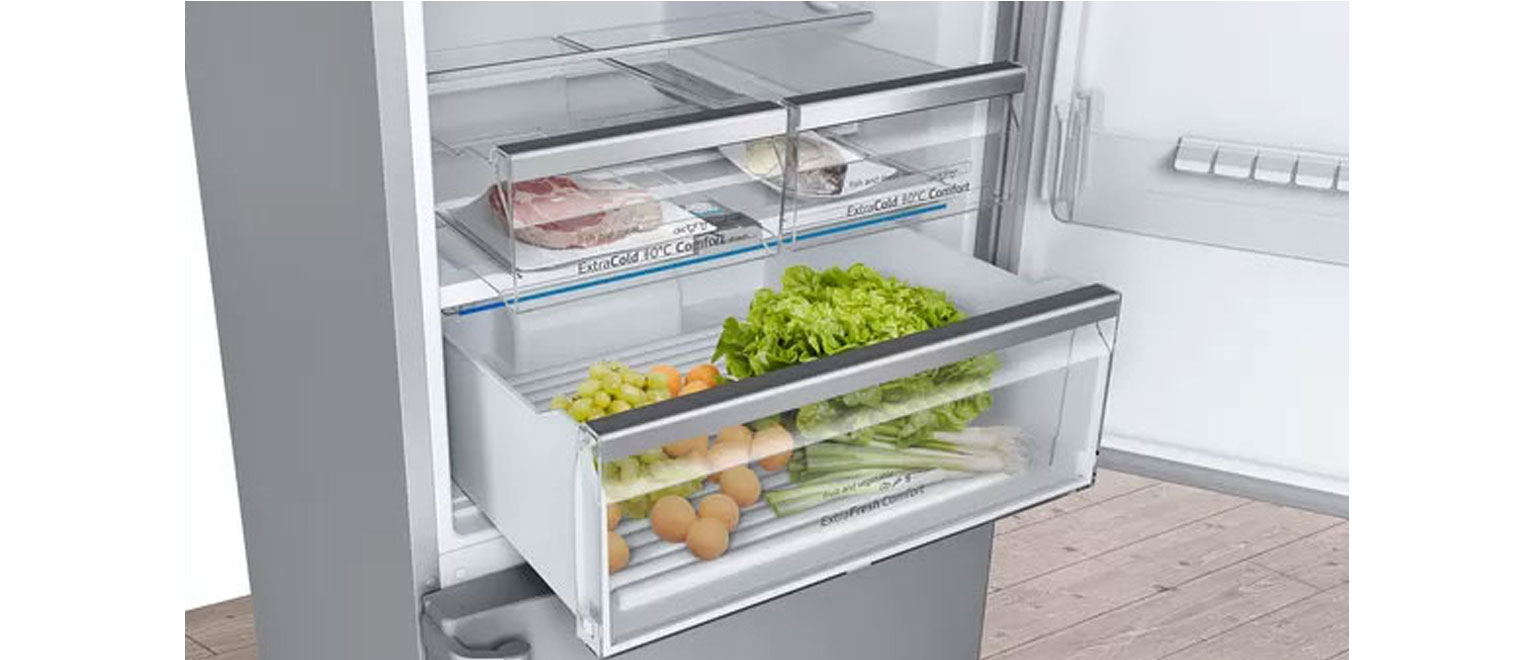 - ExtraFresh Comfort: μεγάλο συρτάρι φρούτων και λαχανικών με ρυθμιστή υγρασίας για τη διατήρηση τους έως και διπλάσιο χρόνο.