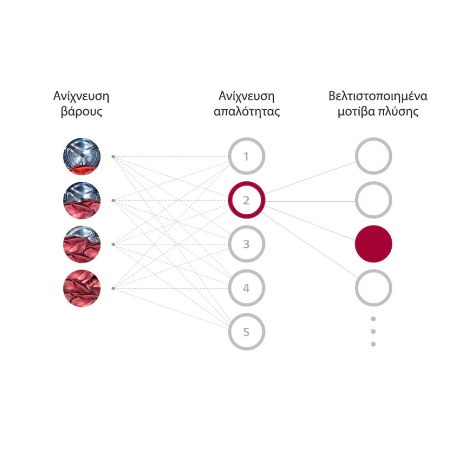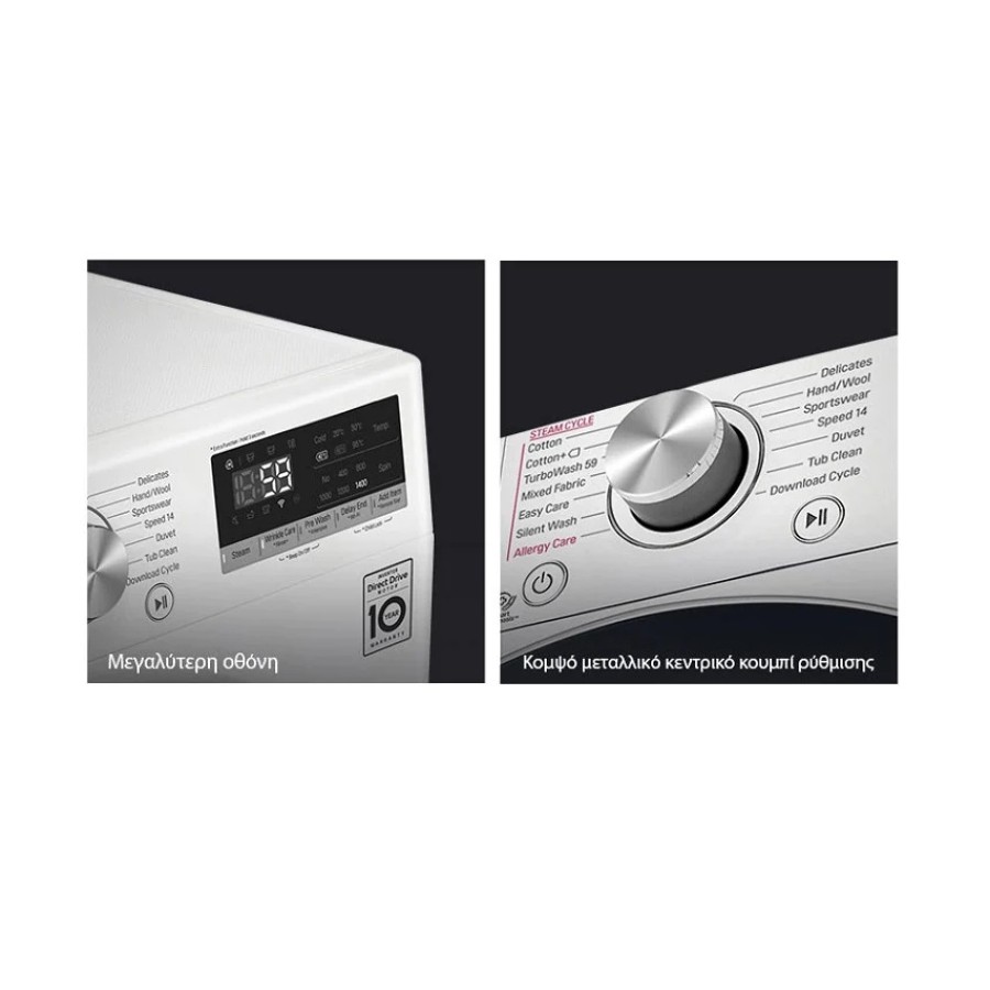 | Επιπλέον Λειτουργίες | 6 Motion (Για βέλτιστη φροντίδα στα υφάσματα )|AI DD™ (18% Λιγότερες φθορές στα Υφάσματα)|Smart Diagnosis (Για γρήγορη διάγνωση βλαβών)|Ένδειξη βλάβης στην οθόνη|Ενεργοποίηση / απενεργοποίηση βομβητή, Καθαρισμός Κάδου|Συνδεσιμότητα NFC |