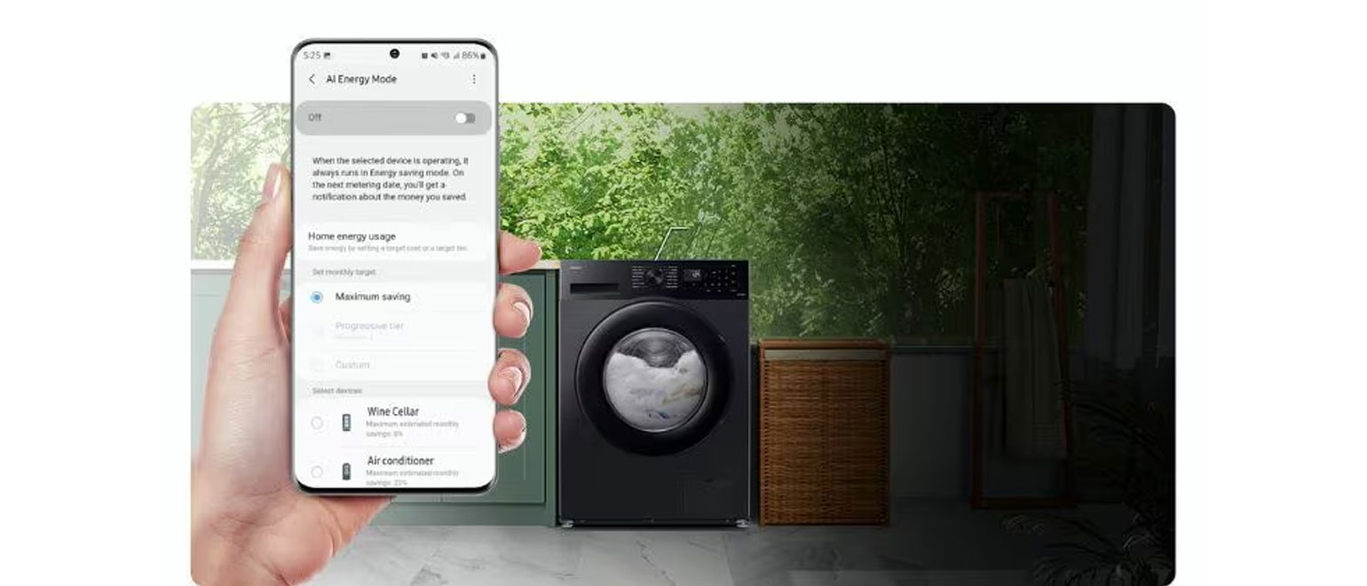 Με την ενσωματωμένη συνδεσιμότητα Wi-Fi και τη συμβατότητα με την εφαρμογή SmartThings, μπορείς να ελέγχεις το πλυντήριο σου εξ αποστάσεως. Προγραμμάτισε, άλλαξε ρυθμίσεις ή έλεγξε την κατανάλωση ενέργειας εύκολα από το κινητό σου. Επιπλέον, η λειτουργία AI Energy προσαρμόζει την κατανάλωση ενέργειας με στόχο να πετύχεις εξοικονόμηση έως και 70% σε σύγκριση με τα συμβατικά προγράμματα.