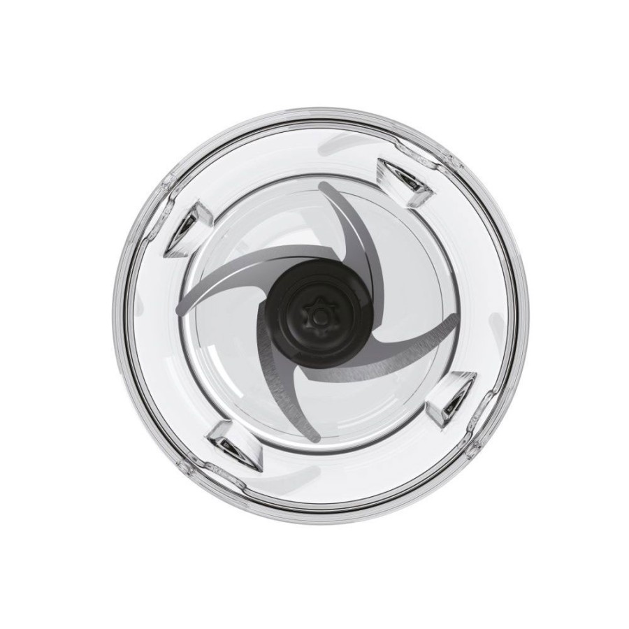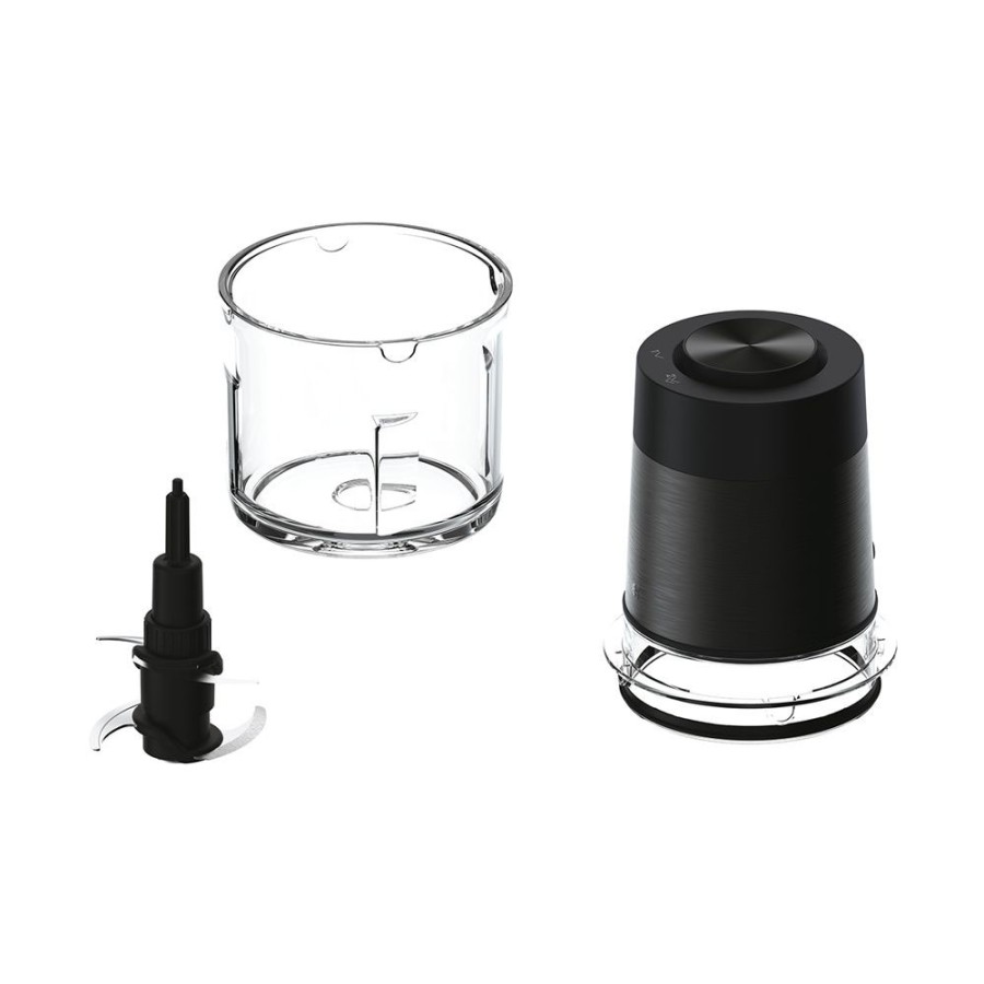 Διαθέτει κρυστάλλινο δοχείο, πολύ υψηλής αντοχής, για την επεξεργασία των υλικών που μπορεί να πλυθεί ακόμη και στο πλυντήριο πιάτων. Κατά τη χρήση τοποθετείται επάνω σε προστατευτική, αντιολισθητική βάση απο καουτσούκ που περιέχεται στη συσκευασία.