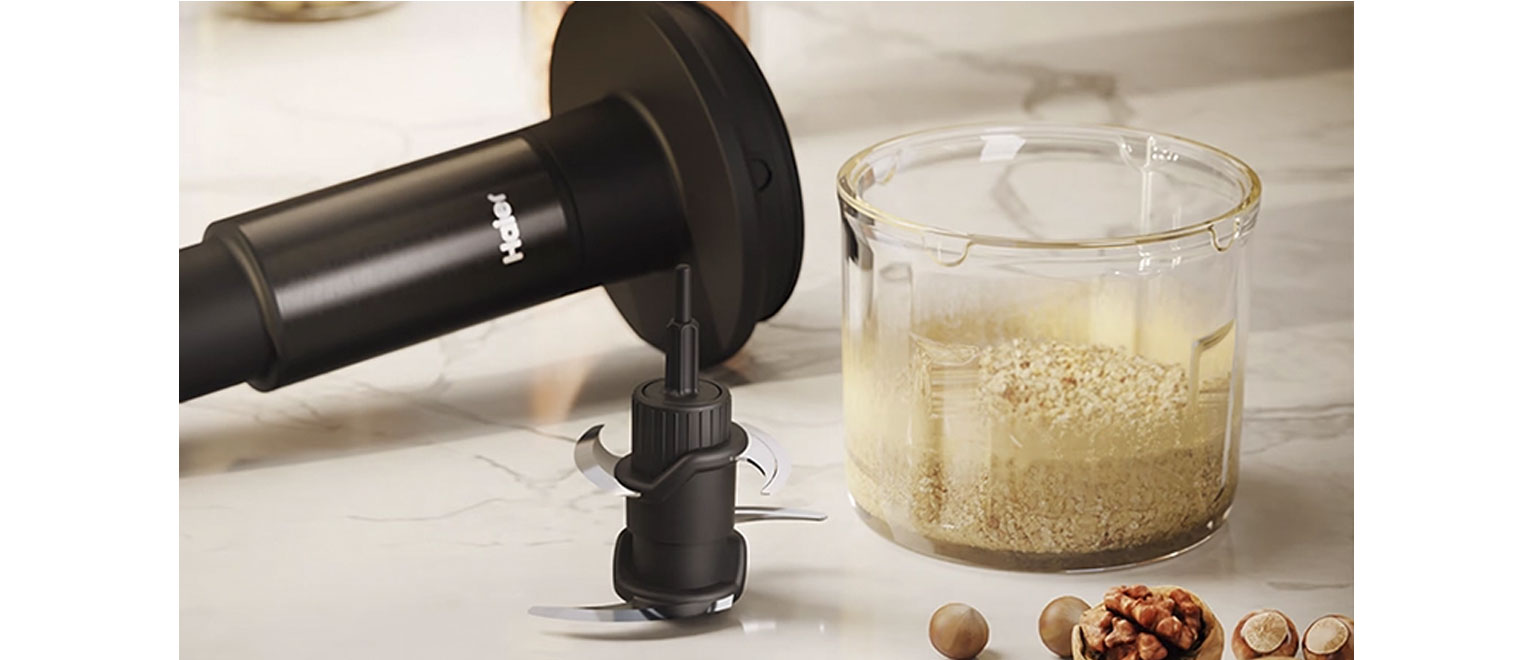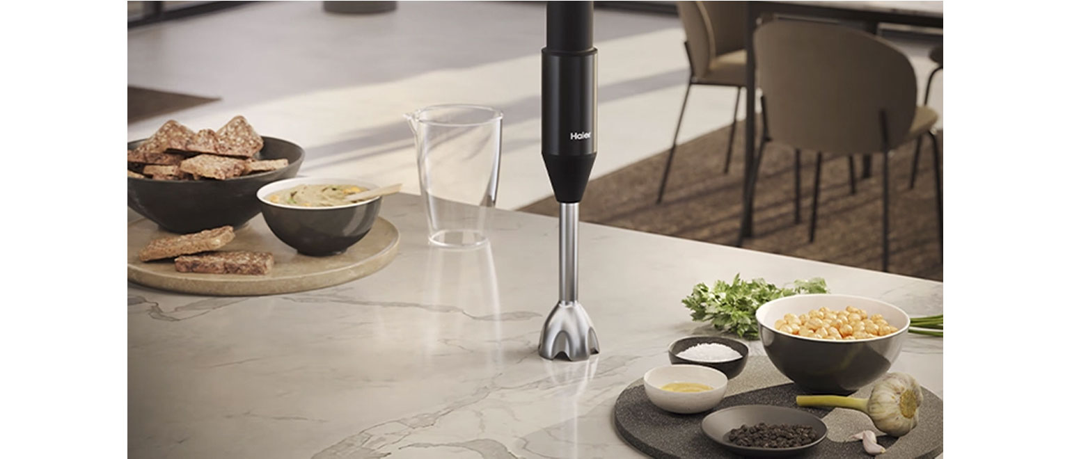 Με το νέο Hand Blender της σειράς i-Master της Haier, μπορείς να εκτελέσεις πολλές εργασίες για την προετοιμασία των φαγητών με μια μόνο συσκευή, γρήγορα και εύκολα! Μπορεί να λειτουργήσει σαν 4 συσκευές σε 1 για: την κοπή υλικών στο ειδικό γυάλινο δοχείο, για την κοπή υλικών μέσα στο φαγητό με την μεταλλική ράβδο, για την πολτοποίηση μαλακών υλικών με την ειδική κεφαλή πολτοποίησης ή και για την ανάμιξη υλικών με την προσθήκη του ειδικού εργαλείου με τους αναδευτήρες