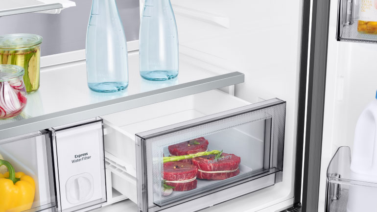Το συρτάρι multi pantry προσφέρει 3 επιλογές αποθήκευσης τροφίμων. Φρούτα και λαχανικά στη θερμοκρασία του ψυγείου, ποτά και αναψυκτικά στον 1 0C ή κρέας και ψάρι στον - 1 0C.