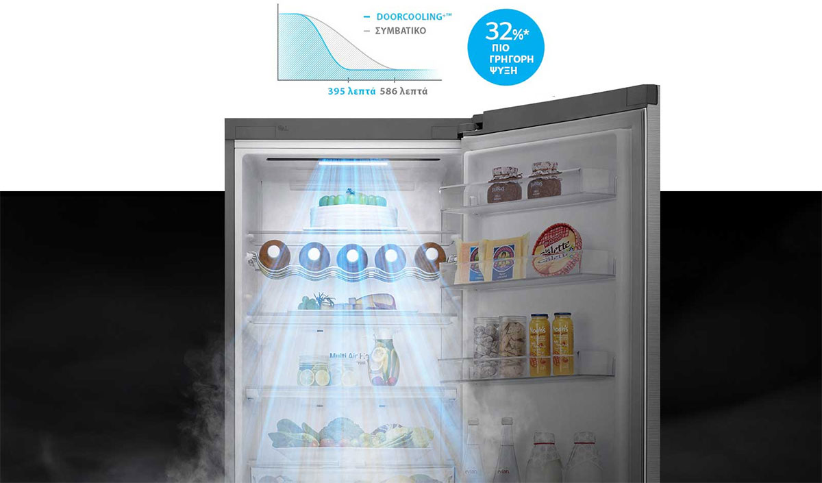 Έως 32%* πιο γρήγορη & ομοιόμορφη ψύξη, παντού. Οι αεραγωγοί στο μπροστινό μέρος του ψυγείου βοηθούν στη διατήρηση της θερμοκρασίας ώστε να διατηρούνται τα τρόφιμά σου φρέσκα. * Με βάση τα αποτελέσματα δοκιμών UL χρησιμοποιώντας εσωτερική μέθοδο ελέγχου της LG, συγκρίνοντας τον χρόνο που απαιτείται για να πέσει η θερμοκρασία του επάνω καλαθιού από 24,8 ℃ σε 8 ℃ μεταξύ του μοντέλου Non-DoorCooling+ (GBB60NSZHE) και DoorCooling+ (GBB72NSDFN) της LGE.Ακριβής έλεγχος θερμοκρασίας