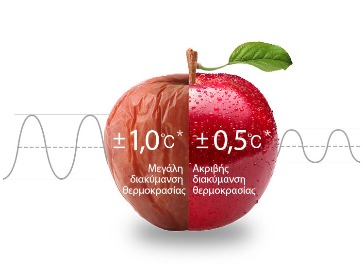 24ωρη ομοιόμορφη ψύξη ±1,0 °C *: Μεγάλη διακύμανση θερμοκρασίας ±0,5 °C * : Ακριβής διακύμανση θερμοκρασίας *Με βάση τα αποτελέσματα δοκιμών UL χρησιμοποιώντας εσωτερική μέθοδο ελέγχου της LG για τη μέτρηση της μέσης απόκλισης θερμοκρασίας αιχμής στο χώρο των φρέσκων τροφίμων, μεταξύ των μοντέλων LGE ψυγειοκαταψύκτης GBB72NSDFN (±0,5 ℃), French Door GF-L570PL (±0,5 ℃), ψυγείο-ντουλάπα J811NS35 (±0,5 ℃), δίπορτο ψυγείο B607S (±0,5 ℃) και δίπορτο ψυγείο B606S (±1,0 ℃). *Χωρίς φορτίο και κανονική ρύθμιση θερμοκρασίας. Το αποτέλεσμα μπορεί να διαφέρει στην πραγματική χρήση.