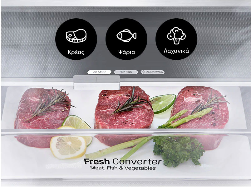 Επίλεξε τη βέλτιστη θερμοκρασία ανά τύπο τροφίμων. Το FRESHConverter διατηρεί σε άριστη κατάσταση το κρέας, τα ψάρια και τα λαχανικά σου αντίστοιχα.