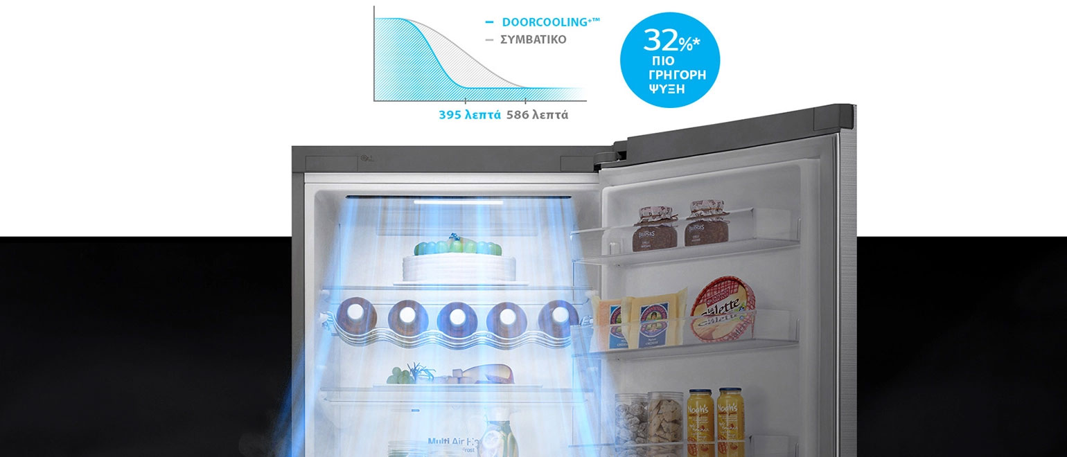 Έως 32% πιο γρήγορη και ομοιόμορφη ψύξη, παντού. Οι αεραγωγοί στο μπροστινό μέρος του ψυγείου βοηθούν στη διατήρηση της θερμοκρασίας ώστε να διατηρούνται τα τρόφιμά σου φρέσκα.