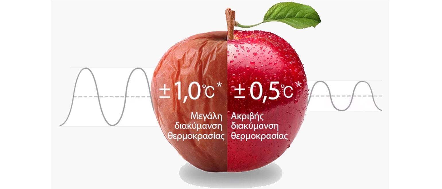 *Με βάση τα αποτελέσματα δοκιμών UL χρησιμοποιώντας εσωτερική μέθοδο ελέγχου της LG για τη μέτρηση της μέσης απόκλισης θερμοκρασίας αιχμής στο χώρο των φρέσκων τροφίμων, μεταξύ των μοντέλων LGE ψυγειοκαταψύκτης GBB72NSDFN (±0,5 ℃), French Door GF-L570PL (±0,5 ℃), ψυγείο-ντουλάπα J811NS35 (±0,5 ℃), δίπορτο ψυγείο B607S (±0,5 ℃) και δίπορτο ψυγείο B606S (±1,0 ℃).