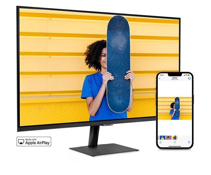 Συνδεσιμότητα κινητών τηλεφώνων. Βολική συνδεσιμότητα. Με την ενσωμάτωση AirPlay, μπορείτε να συνδέσετε ασύρματα συσκευές Apple στο Smart Monitor και να προβάλλετε σε μεγαλύτερη οθόνη. Απολαύστε το αγαπημένο σας περιεχόμενο από ένα iPhone, iPad και Mac στο Smart Monitor και ακόμη και εφαρμογές, έγγραφα και ιστότοπους.