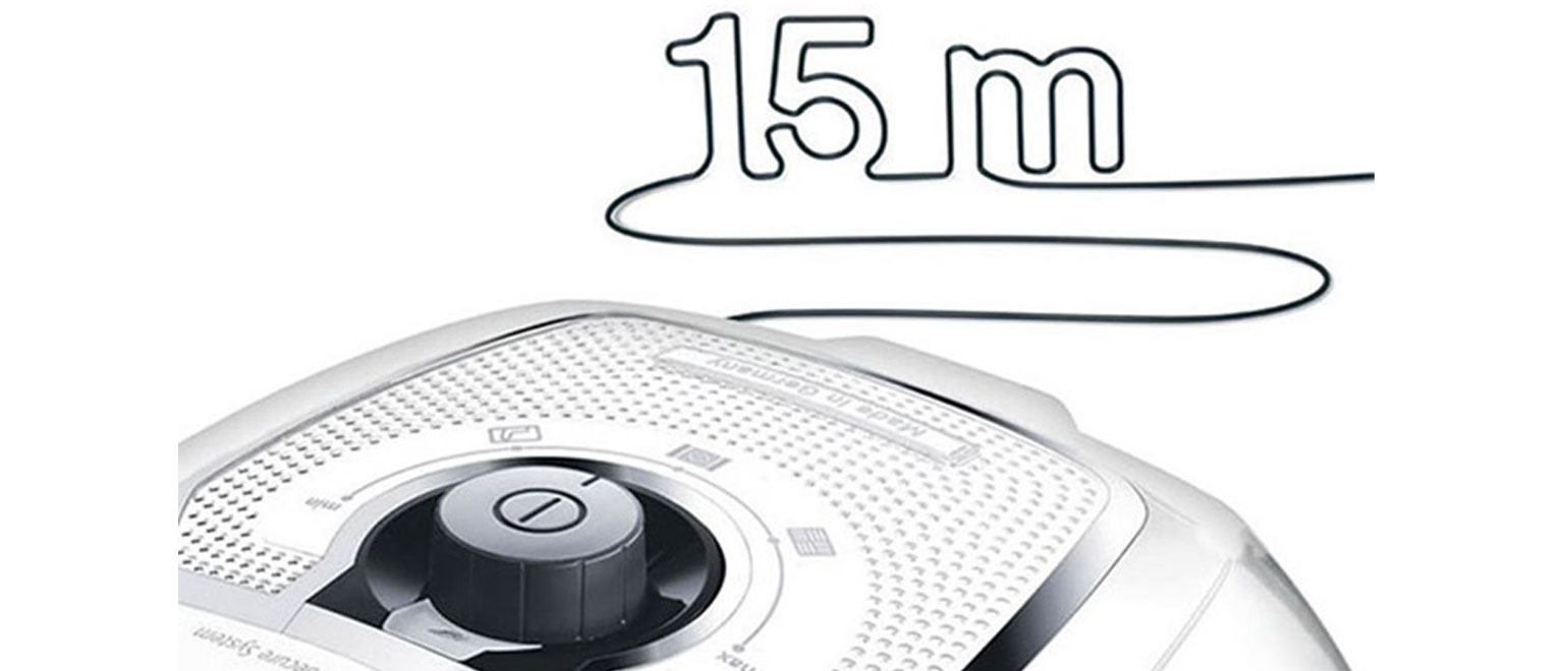 Με πάρα πολύ μακρύ καλώδιο και ακτίνα δράσης 15m για να μη χρειάζεται να ψάχνεται συνεχώς πρίζες στο σπίτι ενώ σκουπίζεται.