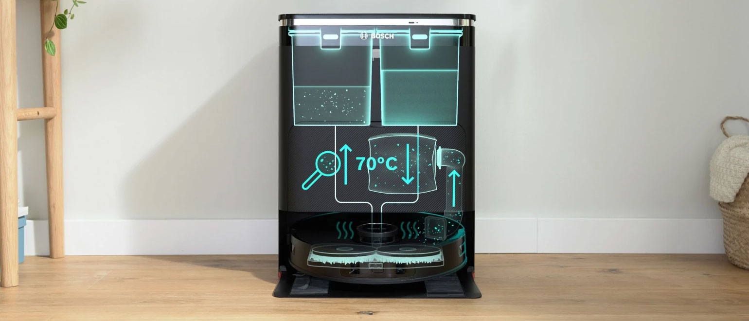 Ο σταθμός φόρτισης και αυτόματου καθαρισμού αδειάζει αυτόματα το ενσωματωμένο δοχείο σκόνης του ρομπότ σε σακούλα μεγάλης χωρητικότητας 3 λίτρων, μειώνοντας τα αδειάσματα και την επαφή με τη σκόνη. Παράλληλα, πλένει τα πανάκια σφουγγαρίσματος στους 70°C και τα στεγνώνει με ζεστό αέρα, εξασφαλίζοντας μέγιστη υγιεινή. Ένας αισθητήρας ελέγχει αν χρειάζεται επιπλέον καθαρισμός και επαναλαμβάνει τη διαδικασία, για πάντα καθαρά πανάκια και άνεση χωρίς κόπο.