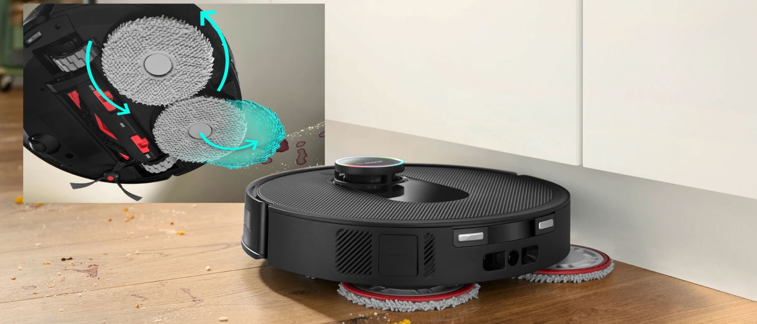 Το επεκτεινόμενο περιστρεφόμενο πανί σφουγγαρίσματος καθαρίζει σε απόσταση λιγότερη από 2mm από τους τοίχους και 30mm από τις γωνίες. Επεκτείνεται αυτόματα όταν ο αισθητήρας αντιληφθεί ότι η σκούπα ρομπότ κινείται παράλληλα με τοίχο ή βρίσκεται σε γωνία, στοχεύοντας τις δυσπρόσιτες περιοχές. Έτσι, προσφέρει ολοκληρωμένο καθαρισμό ακριβείας, μειώνοντας την ανάγκη για χειροκίνητο καθάρισμα ακόμα και στα πιο δύσκολα σημεία.