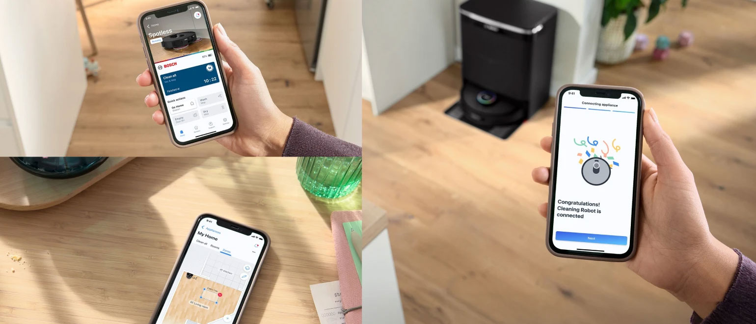 Άμεση σύνδεση και εύκολος, διαισθητικός έλεγχος από το κινητό σου. Η εφαρμογή Bosch Home Connect συνδέεται γρήγορα με το ρομπότ Spotless, προσφέροντας φιλικό περιβάλλον και πολλές επιλογές προσαρμογής. Μπορείς να διαχειρίζεσαι τη συσκευή σου με ευκολία και να λαμβάνεις σαφείς ειδοποιήσεις στο κινητό σου.