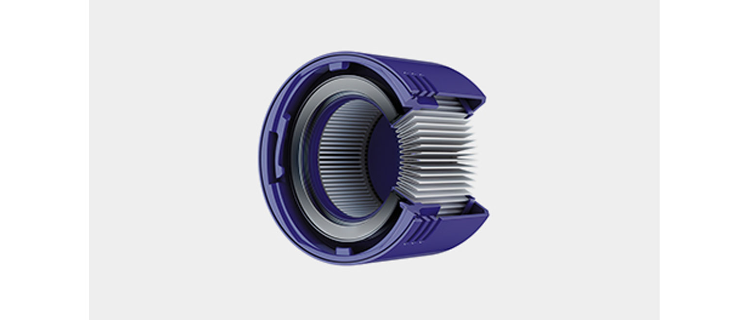 Το πλήρως σφραγισμένο σύστημα φιλτραρίσματος της Dyson συλλαμβάνει τη σκόνη και παγιδεύει το 99,99% των μικροσκοπικών σωματιδίων τόσο μικρών όσο 0,3 microns2.