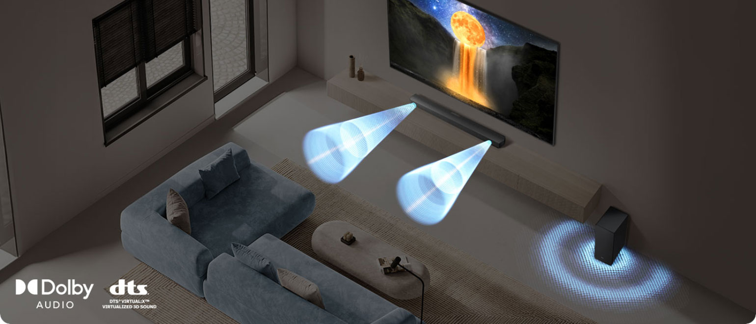 Ζήσε μια πραγματικά καθηλωτική εμπειρία ακρόασης με τις τεχνολογίες Dolby Audio και DTS Virtual:X, που δημιουργούν εντυπωσιακό, τρισδιάστατο surround ήχο. Απόλαυσε την αίσθηση ότι ο ήχος σε περιβάλλει από κάθε κατεύθυνση — χωρίς την ανάγκη επιπλέον ηχείων.