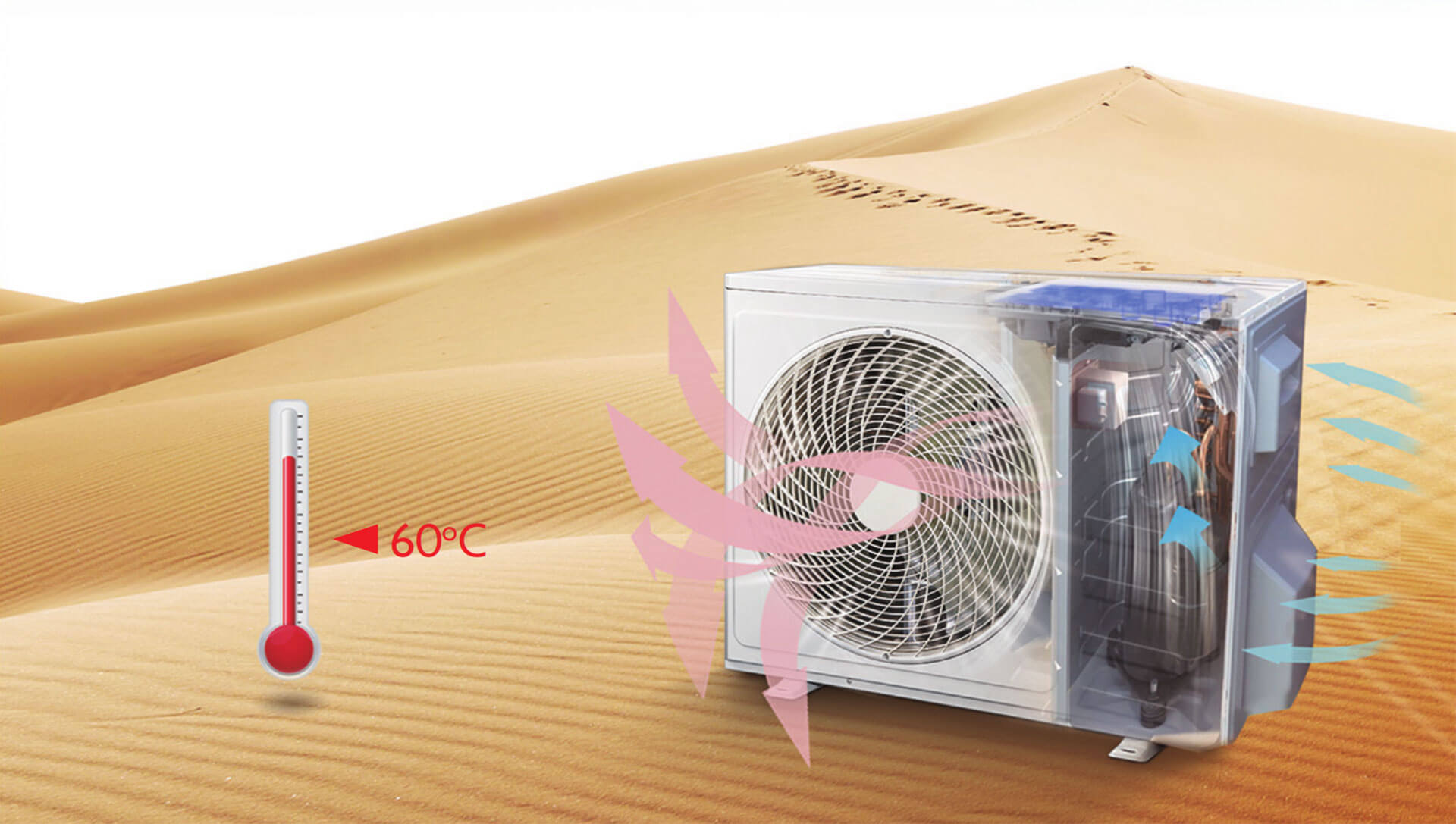 Η λειτουργία ψύξης διατηρείται σταθερή ακόμη και με 50℃ εξωτερική θερμοκρασία, ενώ διατηρείται σε υψηλά επίπεδα ακόμη και στους 60℃, όπου τα συνηθισμένα κλιματιστικά σταματούν.