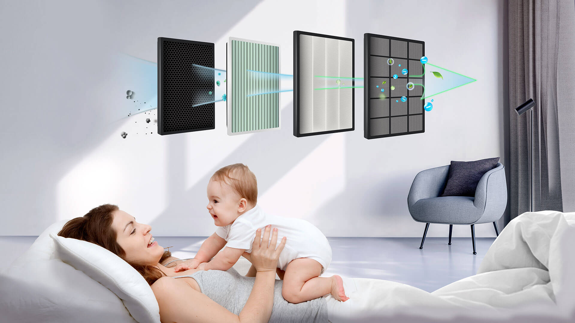 Ο φρέσκος αέρας θα περάσει από 4 διαφορετικά φίλτρα – βασικό φίλτρο, αντιβακτηριδιακό φίλτρο ιόντων αργύρου, φίλτρο HEPA υψηλής απόδοσης και φίλτρο υψηλής πυκνότητας – διασφαλίζοντας έτσι τον εξαιρετικά αποτελεσματικό καθαρισμό του αέρα.