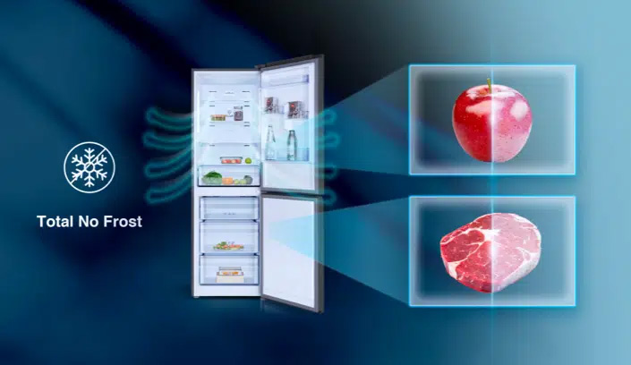 Ο κρύος αέρας κατανέμεται ομοιόμορφα σε κάθε χώρο αποθήκευσης τροφίμων. Η καλύτερη κυκλοφορία του αέρα και η ταχύτερη επιστροφή στην επιθυμητή θερμοκρασία εγγυώνται καλύτερη συντήρηση των τροφίμων.Total No Frost