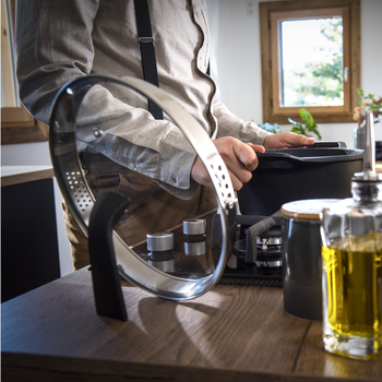 Η έξυπνη σχεδίαση του καπακιού κάνει το μαγείρεμα πιο εύκολο καθημερινά, ελευθερώνοντας χώρο στην επιφάνεια εργασίας με το έξυπνο στήριγμα, ενώ παράλληλα εξασφαλίζει εύκολη αποστράγγιση.
