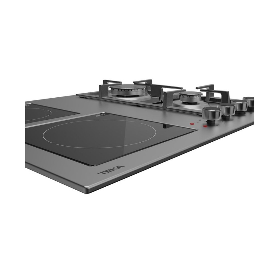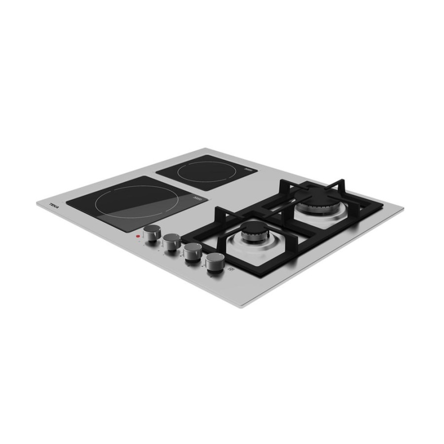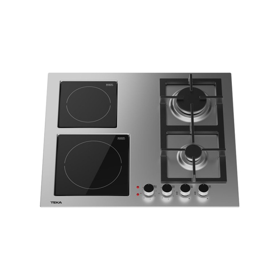 Ανοξείδωτο πλατώ εστιών Teka, πλάτους 60 cm, με 2 εστίες αερίου και 2 κεραμικές - ηλεκτρικές, αυτόματη ανάφλεξη και σύστημα ασφαλείας αυτόματου κλειδώματος.