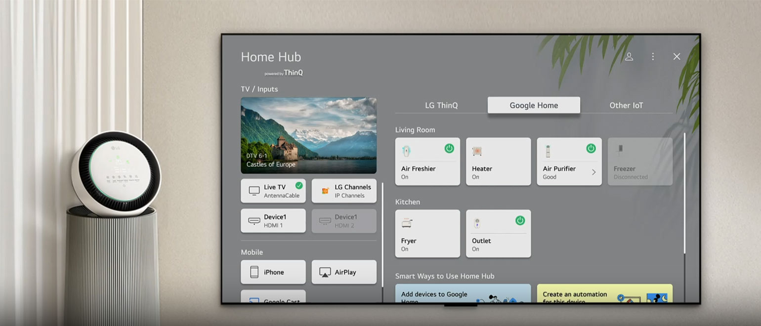 Διαχειρίσου εύκολα διάφορες οικιακές συσκευές LG, μαζί με τις συσκευές σας Google Home και άλλα. Ζήσε την εμπειρία της απόλυτης άνεσης και ελέγχου ολόκληρου του σπιτιού σου μέσω ενός μοναδικού, διαισθητικού πίνακα εργαλείων.