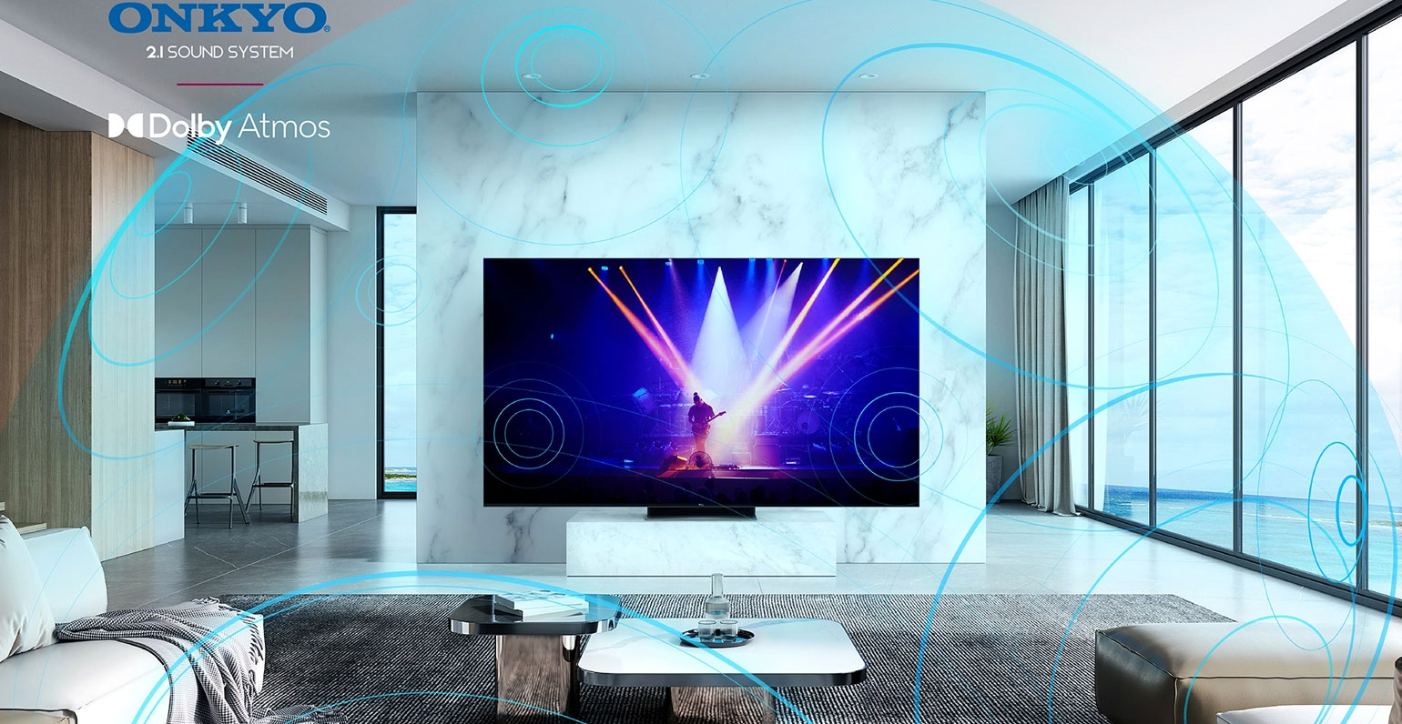 Τα ενσωματωμένα στερεοφωνικά ηχεία ONKYO για ευκρίνεια και το υπογούφερ για βαθιά μπάσα σημαίνει μια πιο καθηλωτική εμπειρία Dolby Atmos στο σπίτι.