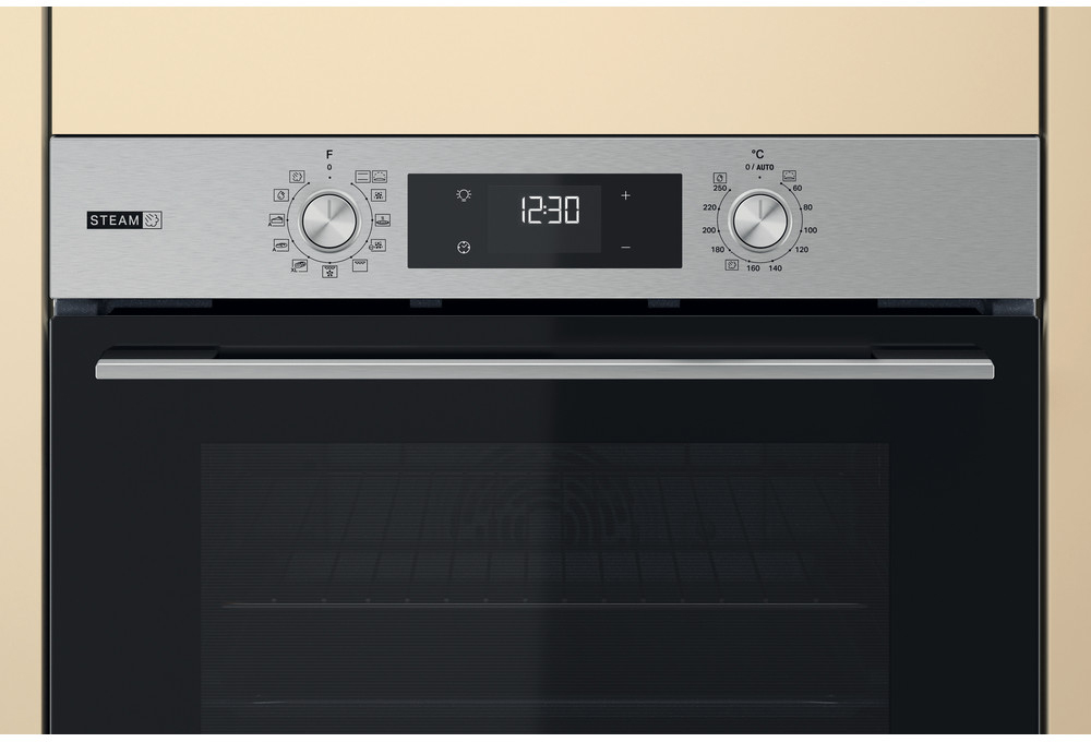 - Οθόνη 7 ψηφίων με 2 βυθιζόμενους διακόπτες, εσωτερικό φωτισμό φούρνου, ρολόι / ηλεκτρονικός προγραμματιστής