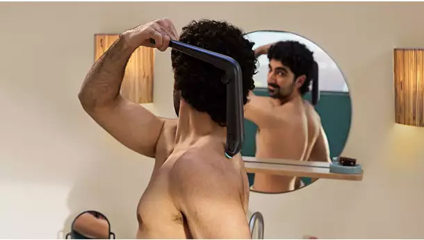 Το πρόσφατα σχεδιασμένο, πτυσσόμενο εξάρτημα πλάτης μας προσφέρει βελτιωμένη εργονομική εμπειρία και βελτιώνει σημαντικά την πρόσβαση σε όλο το σώμα. Η λαβή διαθέτει διάφορες ρυθμίσεις για άνετο ξύρισμα από όλες τις πλευρές.